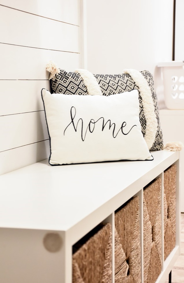 A laundry room is the perfect place for a DIY storage bench. This one by Christina of The Frugal Homemaker holds helpful, farmhouse-inspired baskets and even features a hall tree up top with hooks and a ledge for coats and decor.