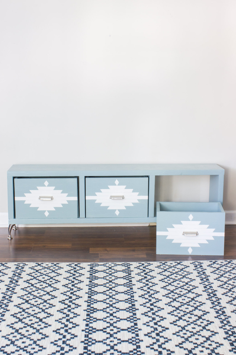 Let's say that you'd like to give your DIY storage bench a bit more personality. In this case, why not try out a pattern? Showcasing a shade of soft blue and geometric detailing, this storage bench handmade by Erin Spain is pleasing to the eye and has three handy drawers.