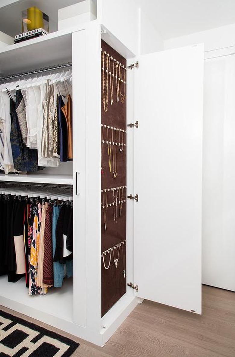 For those who take jewelry organization seriously (and have the room and budget to spare), consider customizing your closet with a dedicated floor-to-ceiling, built-in cabinet that's been tricked out to easily display and access all of your gems. LA Closet Design executed this dreamy wardrobe with a jewelry armoire for a lucky client.