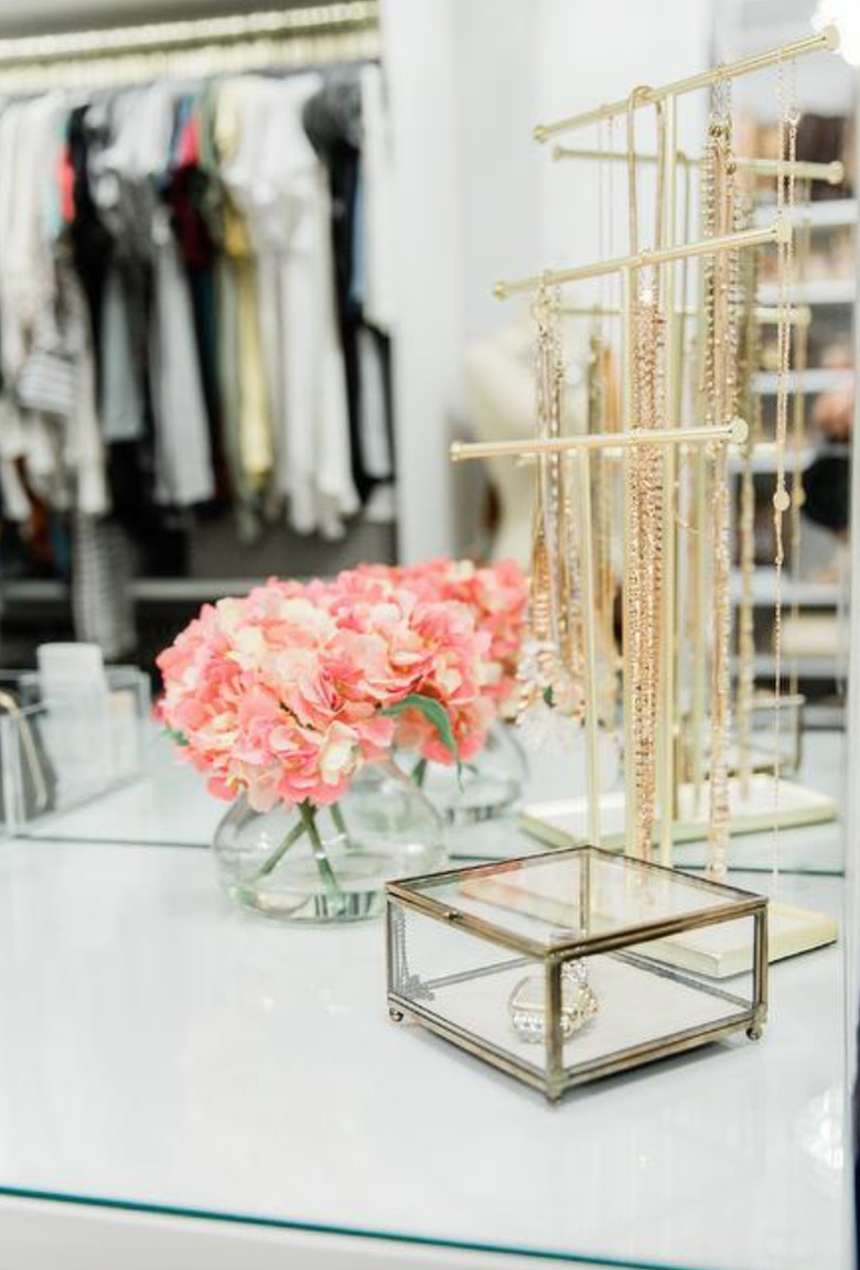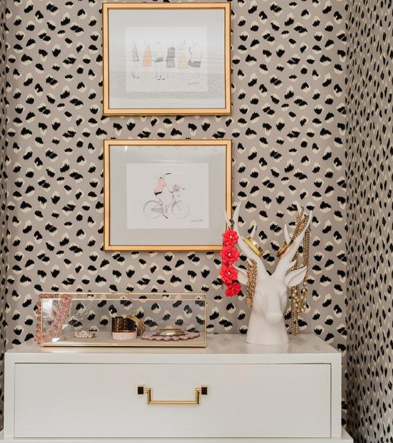 Think outside the (jewelry) box when considering storage and organization ideas for your jewelry, and opt for something kitschy and unexpected instead. The folks at Glickman Design Studio decorated an alcove, perfectly sized to hold a petite dresser, with glam wallpaper, luxe accessories, and a dash of whimsy.