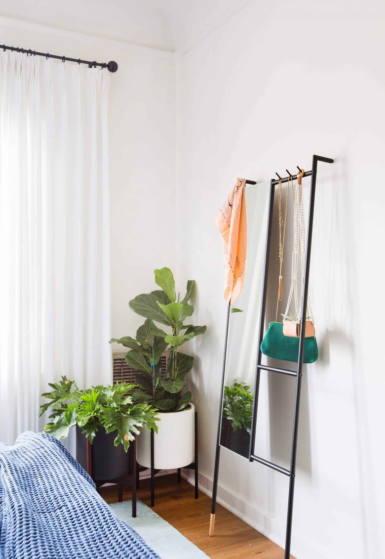 Save precious counter space with a wall-mounted two-in-one mirror and jewelry organizer like this industrial version seen on Style by Emily Henderson. A trio of hooks are strong enough to handle heavier accessories, such as purses, and are the perfect perch to keep necklaces, bracelets, and even larger rings at the ready. The mirror makes putting it all on a cinch.