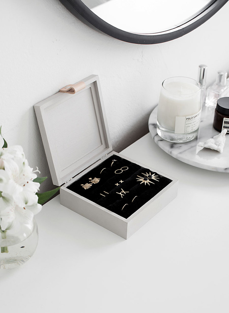 Introduce a timeless jewelry organizer to your repertoire with a white jewelry box featuring simple lines. This one from seen on Homey Oh My (check out the DIY tutorial) is lined in black velvet and caters to earring and ring storage.
