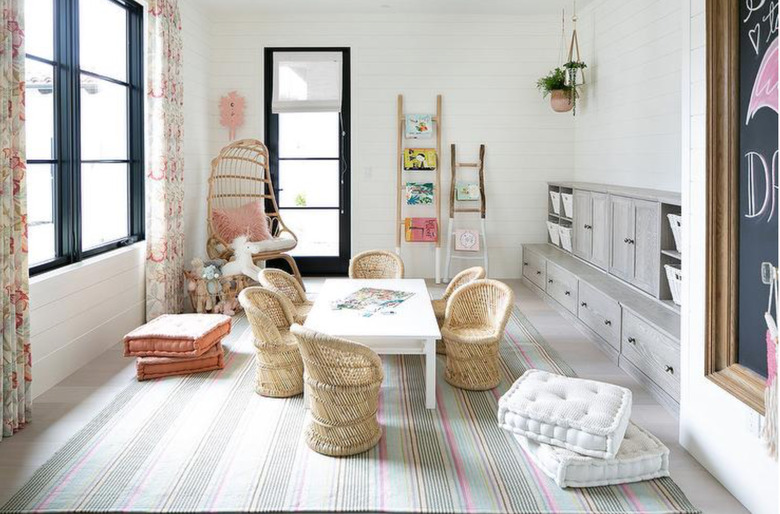 Decorative ladders made their mark as a creative alternative to towel bars in the bathroom and blanket storage in the living room. We love the way that Tracy Lynn Studio repurposes them as a clever way to display books in this approachable yet sophisticated playroom. A muted color palette and woven accents are a timeless combination.