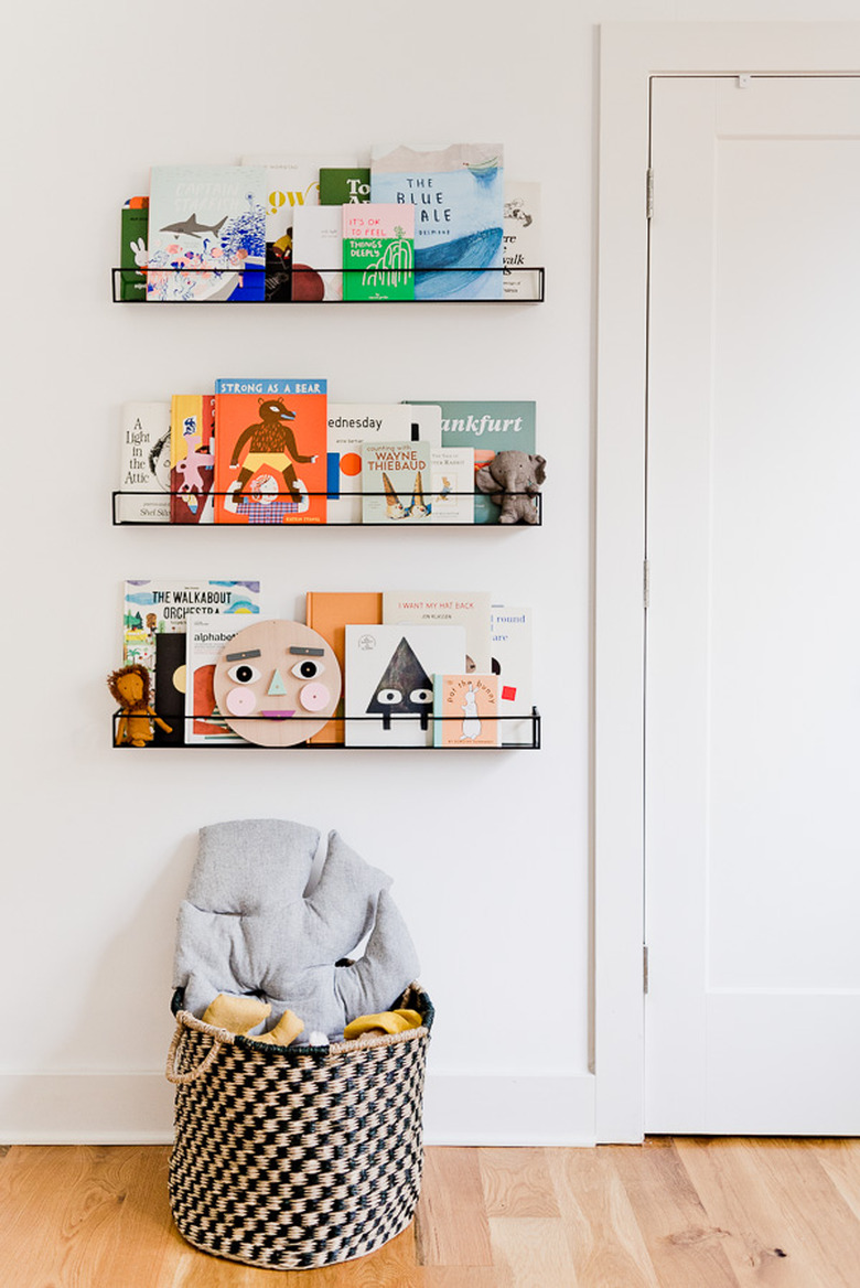 For a cohesive look that doesn't distract from the overall aesthetic, choose a kids' book storage idea that's the same color as the walls. In this bedroom by Amber Interiors, white picture ledges blend into V-groove wall paneling while adding a dose of dimension. Wood accessories and one-of-a-kind textiles infuse plenty of warmth and texture.