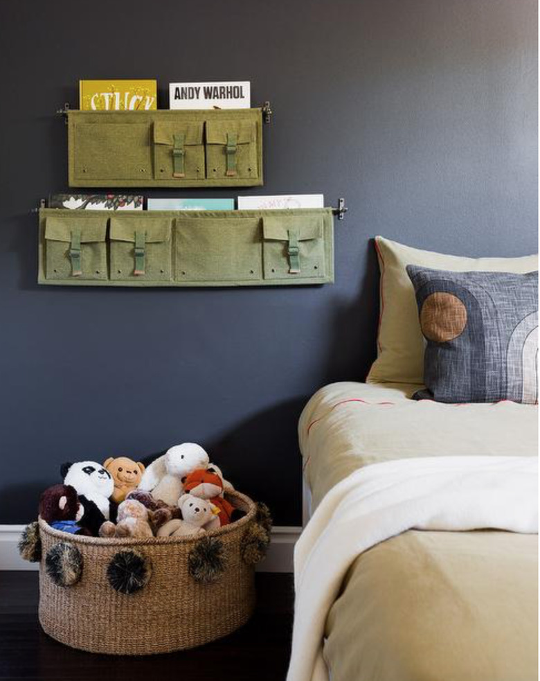 Sandra Fox created an elevated gender neutral bedroom with the bare necessities, including an overflowing basket of stuffed animals and a pair of wall-mounted army green canvas pockets. This kids' book storage idea keeps clutter off of the floor and affords just enough space for a curated selection of child-approved reading material.