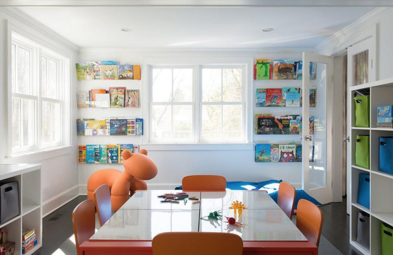 A kids' book storage idea using barely-there acrylic shelves showcases book covers (as opposed to just the spines) enabling them to function as artwork, too. This playroom photographed by Jane Beiles features vibrant colors in measured doses for a look that's understated and still youthful.