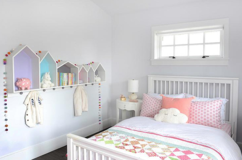 For a kids' book storage idea that will win over parents and children alike, install something whimsical like a row of house-inspired cubbies. Hungerford Interior Design kept the decor in this sweet bedroom pared-down and included a peg rail to maximize the pint-size approach to organization.