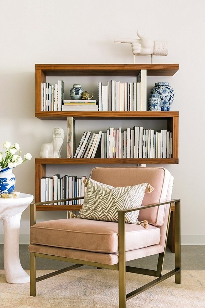 When selecting bookshelves, sure you'll want plenty of room for your growing library, but consider a unit that says something, too. Who isn't loving this modern open-ended option we spotted at Waiting on Martha? Plus, peep how the books are stored with their spines inward, coaxing you to look at each selection so you can keep track of what's on your shelves.