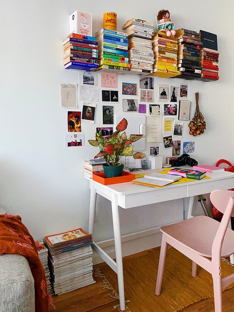 Serious readers, or students, can keep their books sorted easily by using acrylic shelves and stacking away. Take a look at this artistic idea from Yaminah Mayo that almost looks like a wall hanging. Plus, the clever color combos don't hurt either.