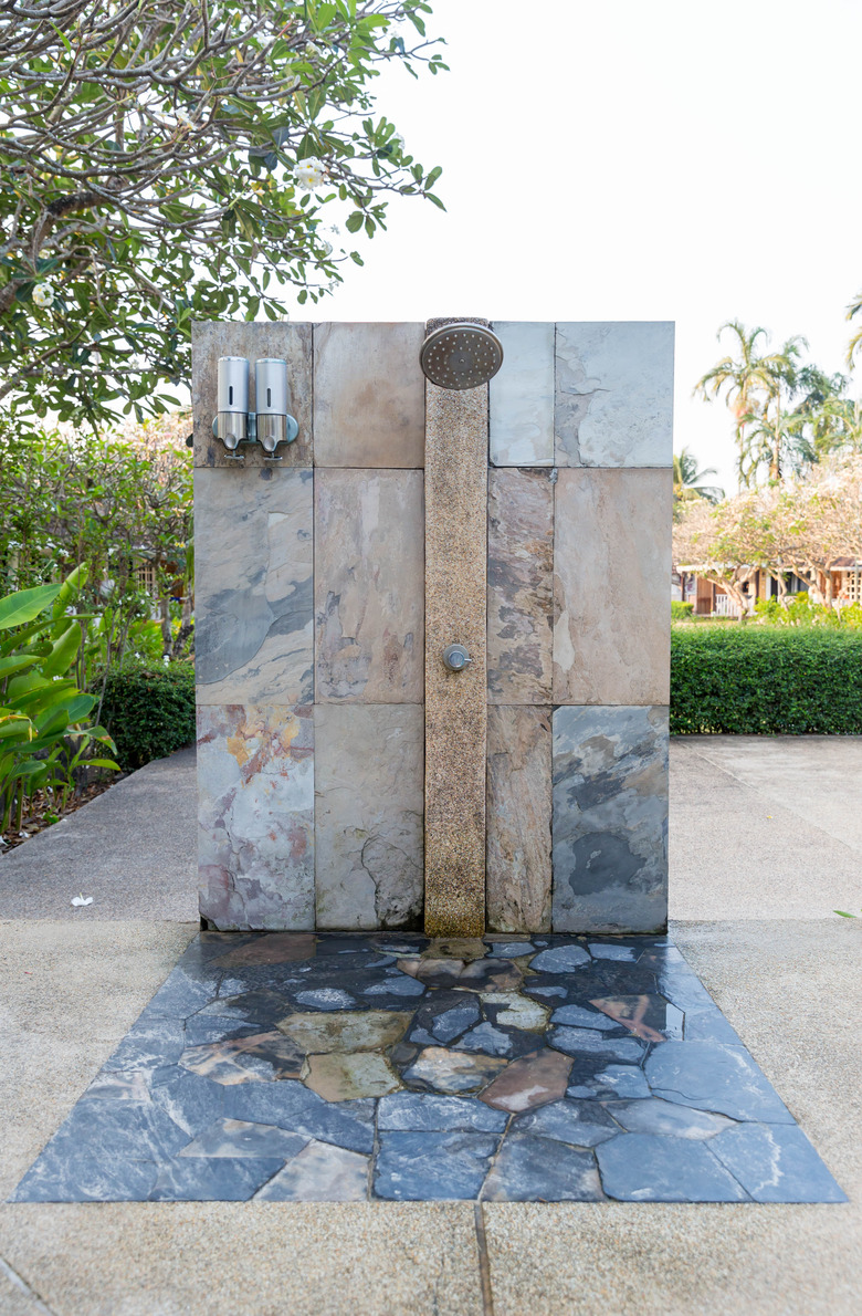 The sophistication of the drainage system for your outdoor shower depends on where you locate it and the applicable local regulations concerning gray water disposal. If you build a high-end shower located on a patio next to the house, you'll probably have to install an underground drain pipe and connect it to the home's waste system. In this case, you'll need all the drain components you'd need for a conventional shower drain, including a 1 1/2-inch plastic P-trap, a vent pipe and a 2-inch waste pipe.