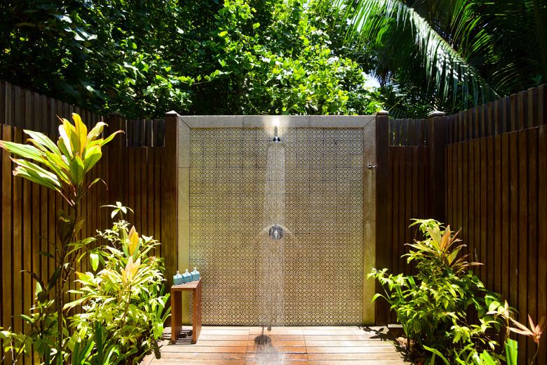 One great thing about outdoor showers is that there are designs to fit every budget. If you don't have a ton of money for your outdoor shower project, consider a DIY outdoor shower kit, many of which require little more than a garden hose to hook up. If you're not big into DIY projects and want to invest more in your outdoor shower enclosure, a kit allows you to construct a complete enclosure for maximum privacy, enjoy both hot and cold water and set up a drain that links to your home's wastewater system rather than allowing the runoff to drain into your landscaping.