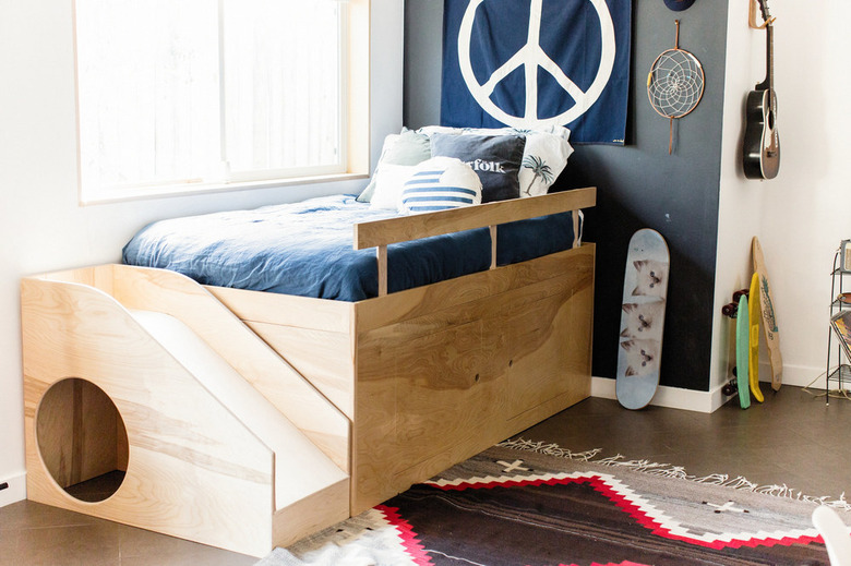 Is your little one's play area short on square footage and storage space? Utilizing the space under the bed is a great way to keep things clutter free and a little more interesting for your child, too! Note the slide and hideout on this slightly raised bed with integrated storage, for example. Super cool, right?
