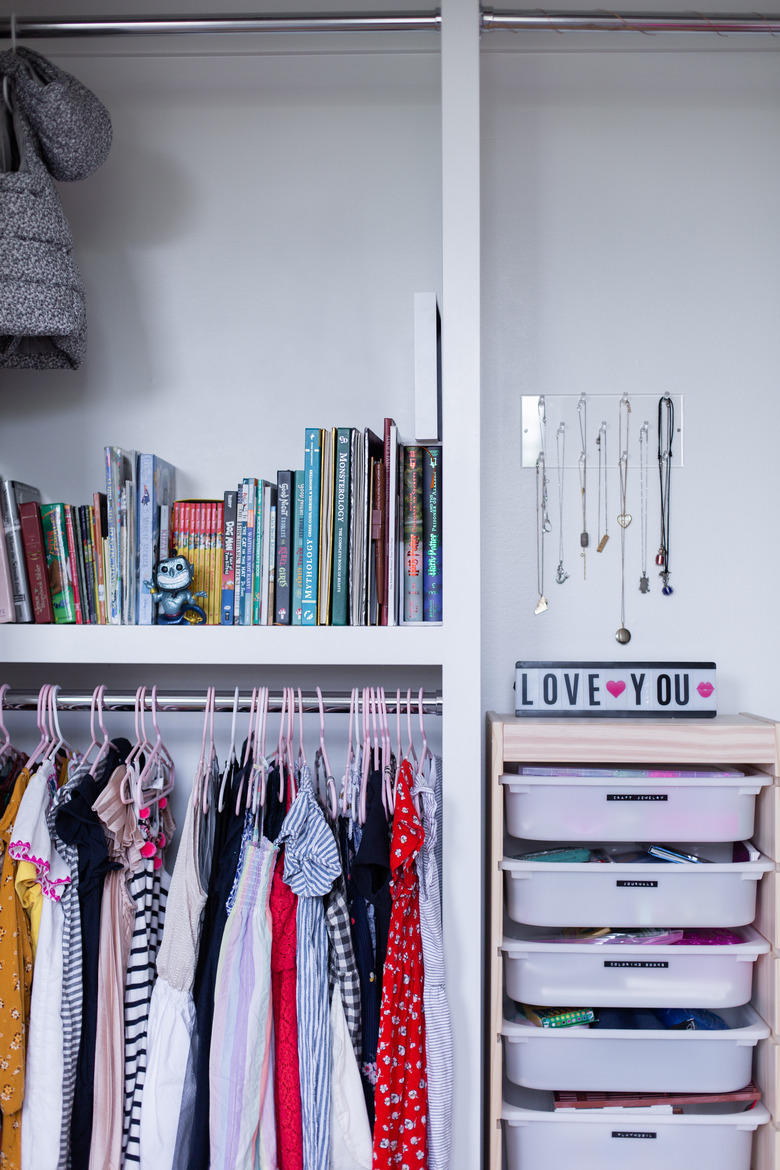 While an organized closet might seem like half a world away in your kid's bedroom, we promise that it is possible! Think about shelving, baskets for extra storage, and dividers for the interior (especially if it's a small spot), and check out these closet design ideas for further inspiration.