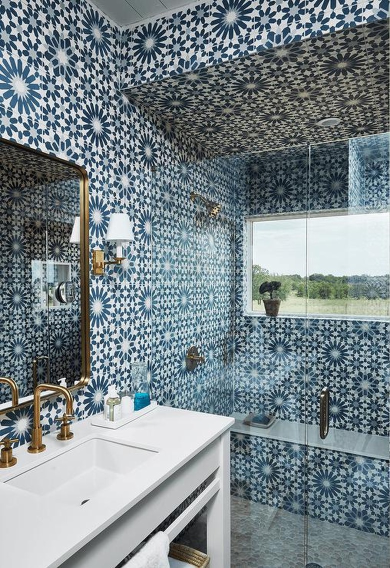 Boho interiors often include multicultural influences such as arches, eclectic rugs, and one-of-a-kind accessories. Jan Jones makes a compelling case for embracing all-over Moroccan-inspired tile in this glam boho bathroom. The detailed pattern energizes the walls and ceiling while the soothing blue and white color combo, traditional home decor, and seamless glass shower enclosure keep the look from feeling overwhelming.