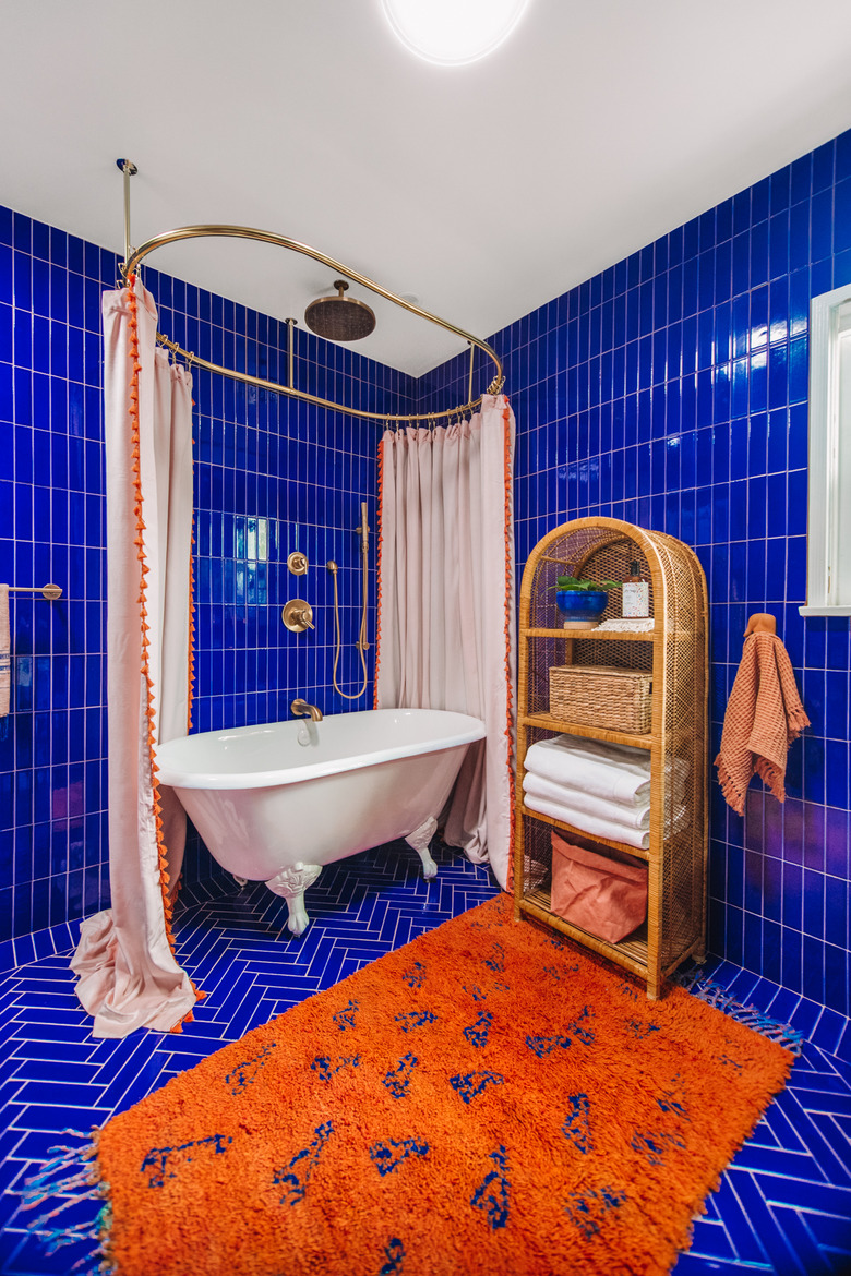 This bohemian bathroom by Kelly of Studio DIY doubles down on saturated, bright colors by combining vibrant cobalt blue tile with equally bold orange tones for a unique boho-maximalist space full of personality. Woven accessories — like a fabric shower curtain with tassel fringe — and white accents — like the clawfoot tub — add visual space and temper the contrasting hues.