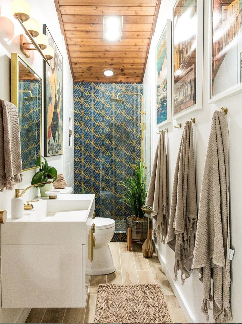 If you're dealing with a spatially challenged bathroom design, think of creative ways to add personality and character. What this petite boho space by Jessica Brigham lacks in square footage, it makes up for with plenty of texture, pattern, and color including a woven bath mat, exposed wood ceiling, and striking wall tile that anchors the shower.
