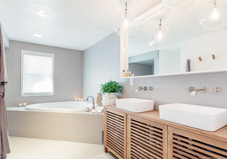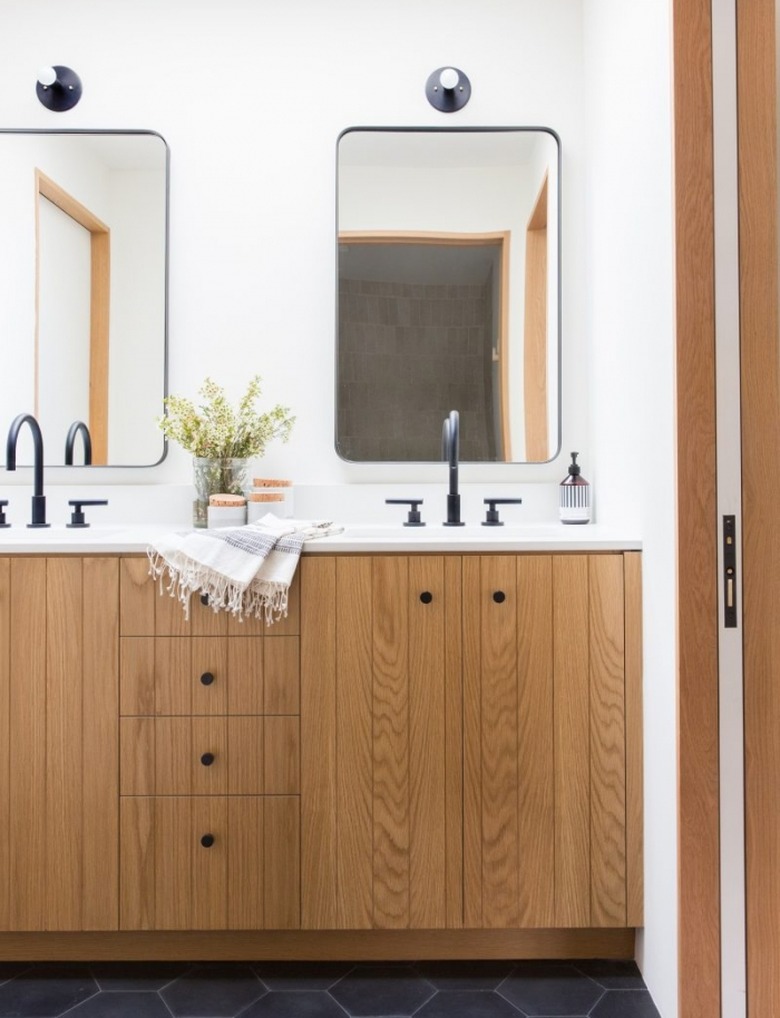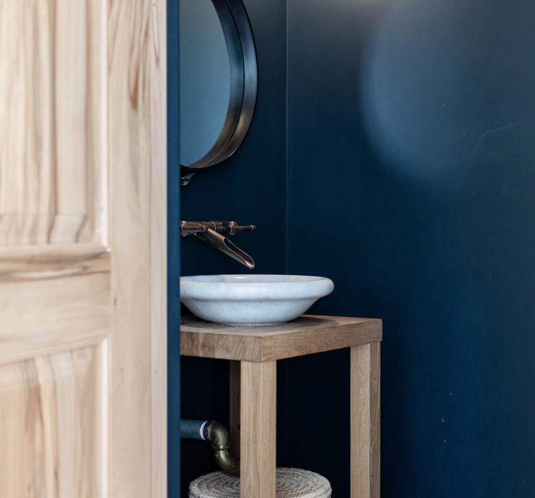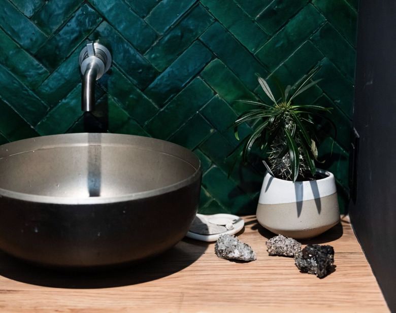 This preppy bathroom styling from Chango & Co. features our favorite traditional trends (hello, black and white gingham) while still feeling cheeky and fresh (thanks to that chrome faucet). Moreover, the simple wall spout strikes the perfect combo of style and functionality but doesn't overwhelm the countertop.