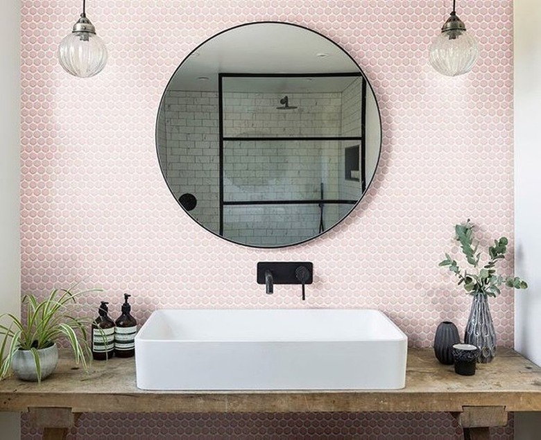 If your countertop needs ample space for all those lotions and potions, try mounting a single handle faucet onto a statement-making backsplash. It'll look stunning, and you can double your bathroom storage. Case in point: This gorgeous vanity that's a combination of rustic and refined. The pink tile, trough sink, and wood accents complement the black faucet perfectly.