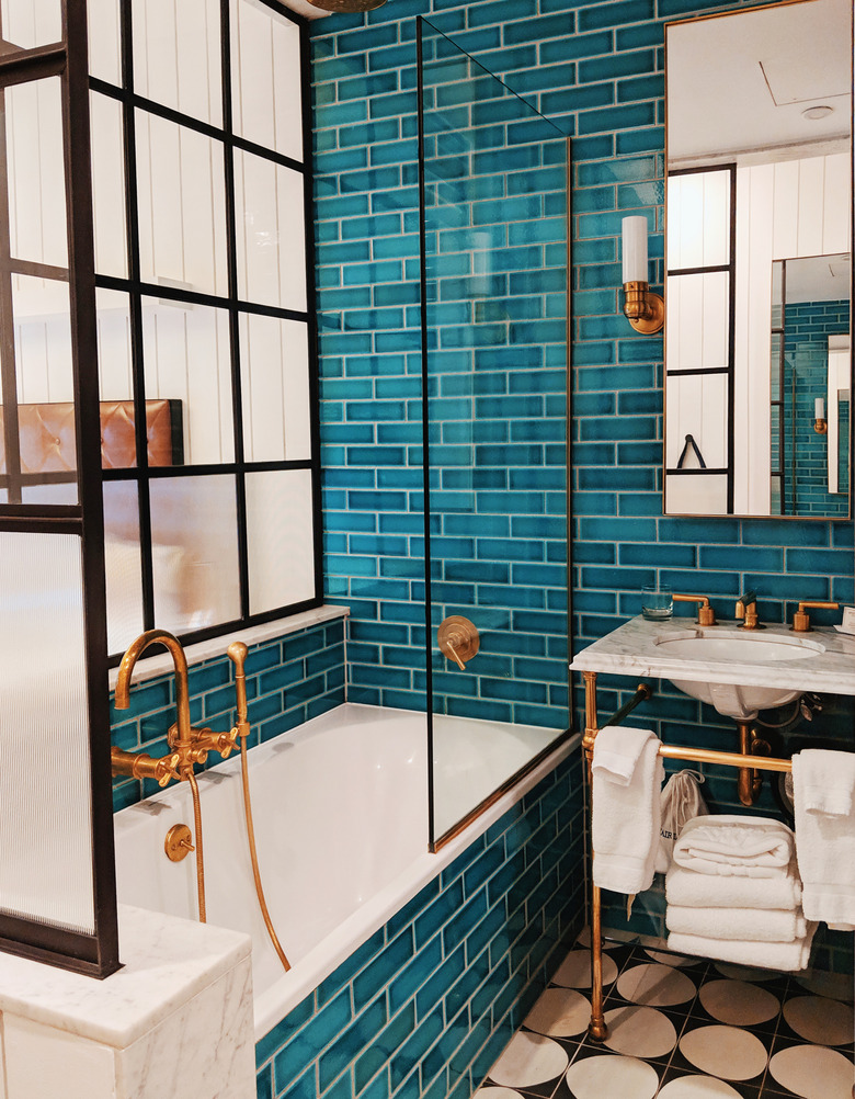 If you're looking for bathroom ideas that wow, the Williamsburg Hotel's teal tile showers, as captured on Sweet Monday, are all the rage. Juxtaposed with elegant, warm metal finishes and sleek, steel-framed glass dividers, the aqua wall tile is undoubtedly a design idea to behold.