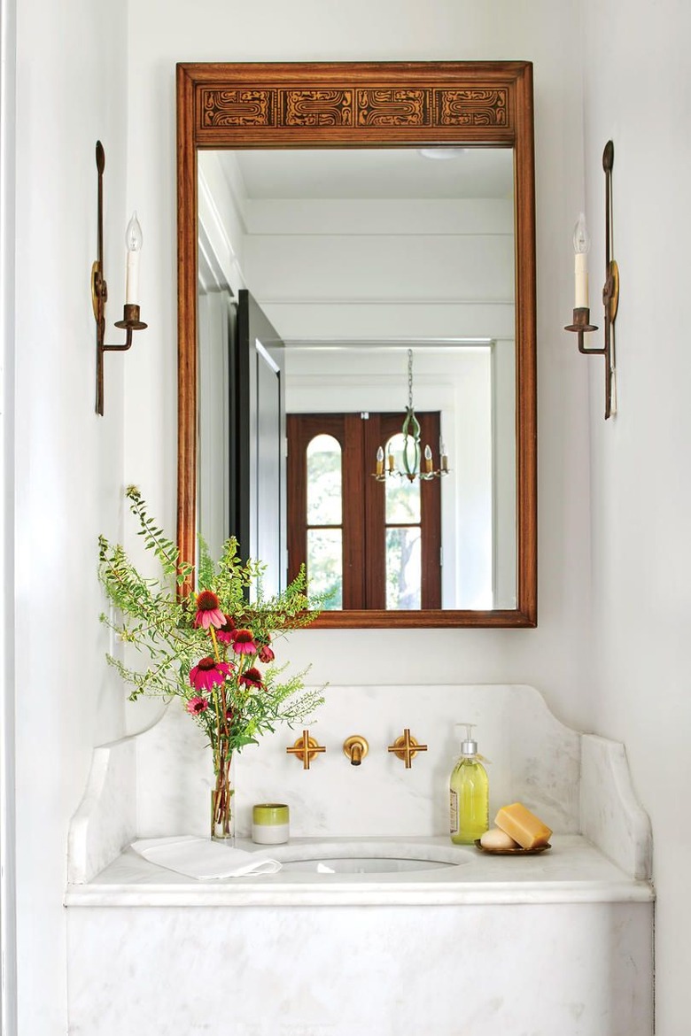Create the right balance between comfort and beauty with an undermount sink surrounded by a natural stone like marble. This gorgeous look in a snug powder room is effortlessly embellished with a vintage mirror and sconces for a timeless feel. And the subtle Carrara backsplash completes the space.
