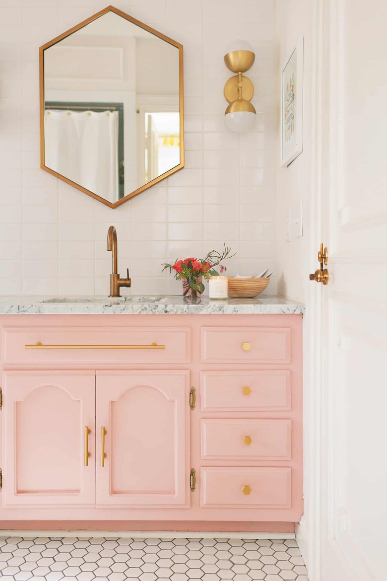 We love how this integrated sink combines old-world charm with a pop of color. The pink vanity would impress any true Francophile, and the gray and white marble countertop seals the deal. Plus, all those brass fixtures are a dream.