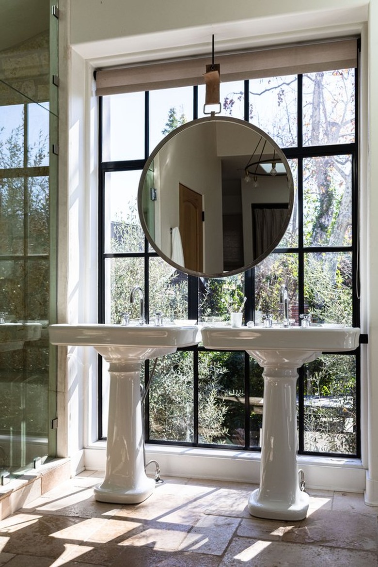 Don't doubt the charm of a classic pedestal sink. Here, a pair of them look absolutely stunning in front of a large window. The airy elegance of this bathroom design with a rustic stone floor could even work in a loft space.