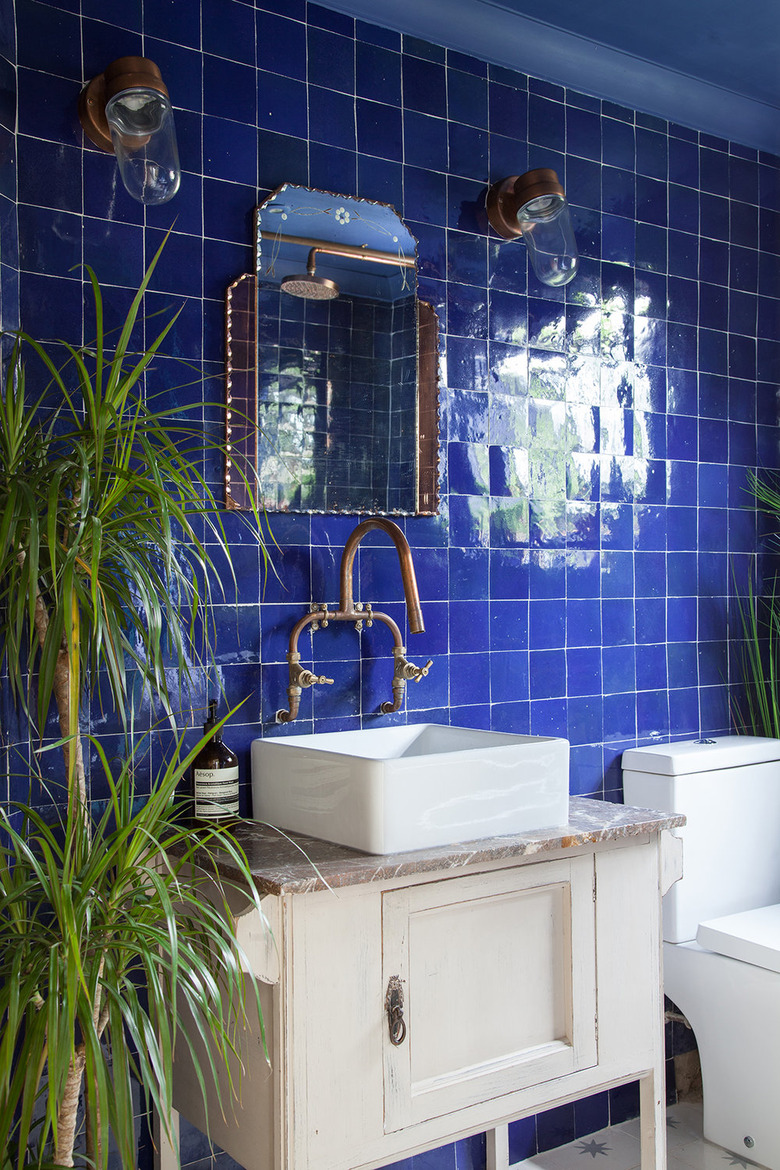Vintage brass will give an elegant edge to a classic marble bathroom, especially if you pair it with a green or blue color palette. Take a look at the wall-mounted faucet in this timeless suite for a lesson in making a modern aesthetic blend with Downton Abbey vibes.