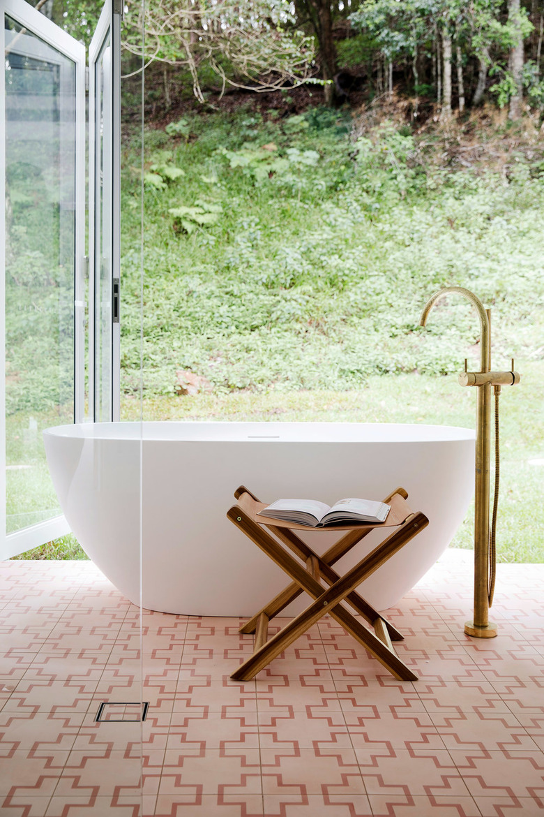 Brass hardware in a minimal bathroom makes for interior magic, and this space designed by Three Birds Renovation is here to prove it. The freestanding basin is paired with a brass tub filler that adds a little bit of luxury to the setup. And we can't get enough.