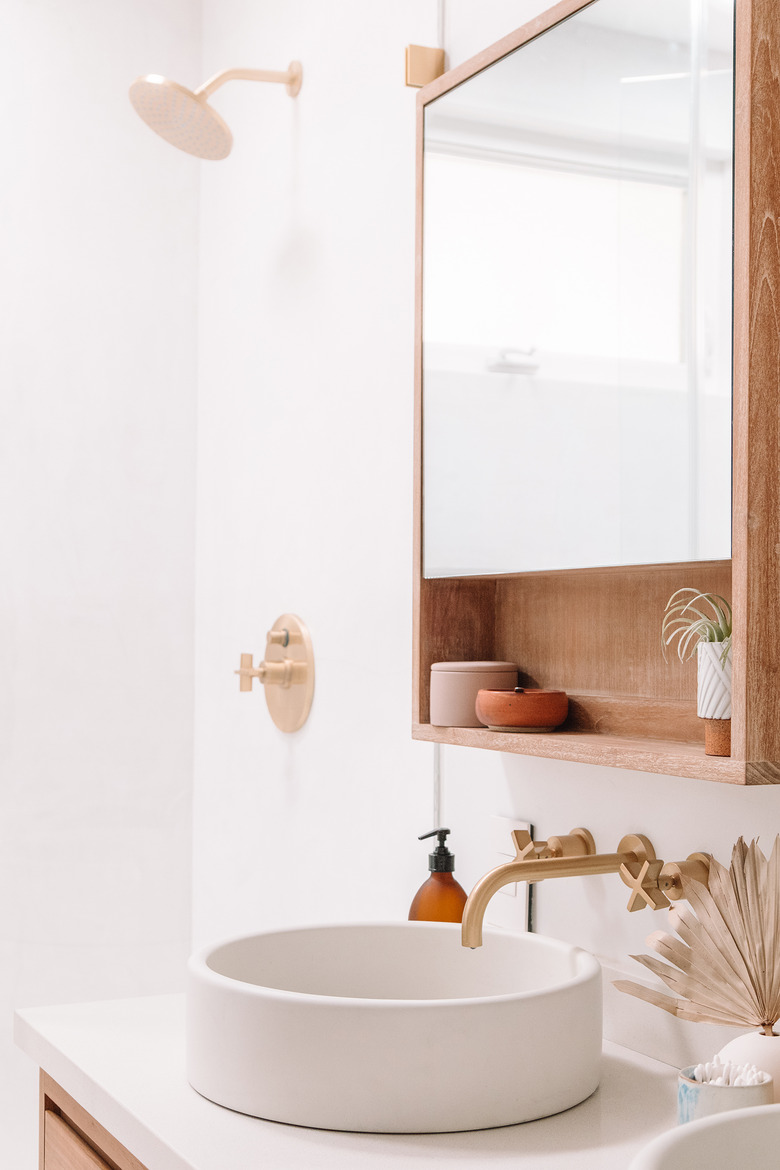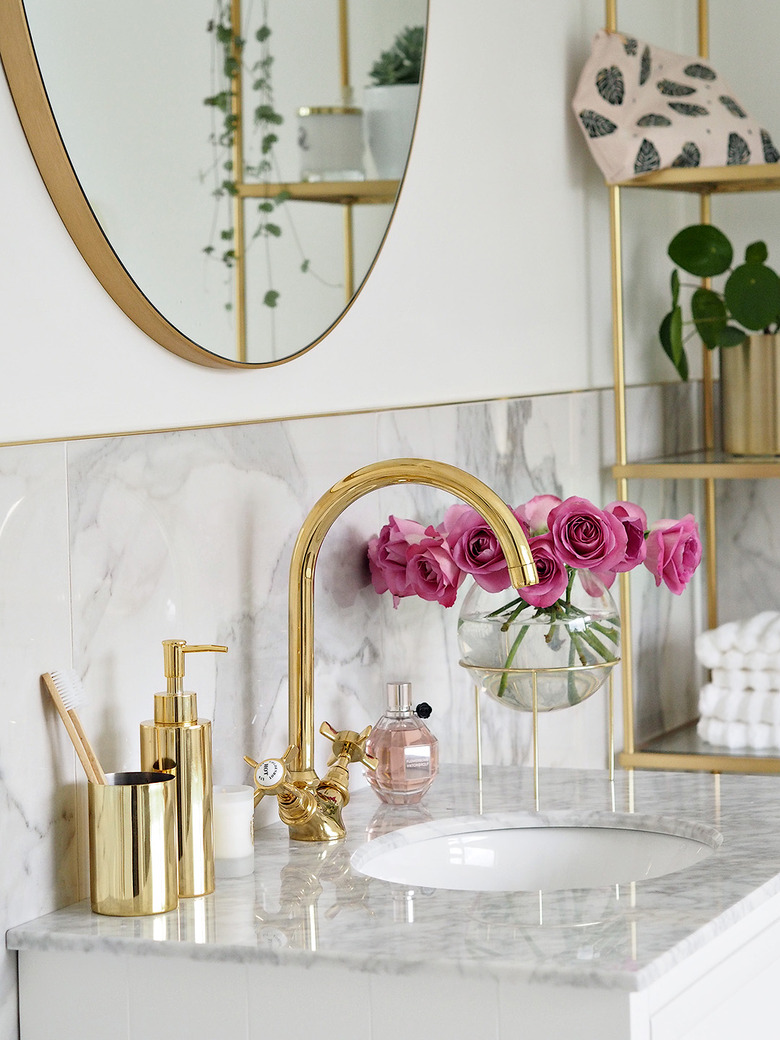 Some people will tell you not to overdo the brass finishes, but we're all for the "more is more" approach. Olivia of Lust Living got it just right in her modern bathroom. The antique-style lavatory faucet is in good company with a round brass mirror, soap dispenser, and freestanding shelf.