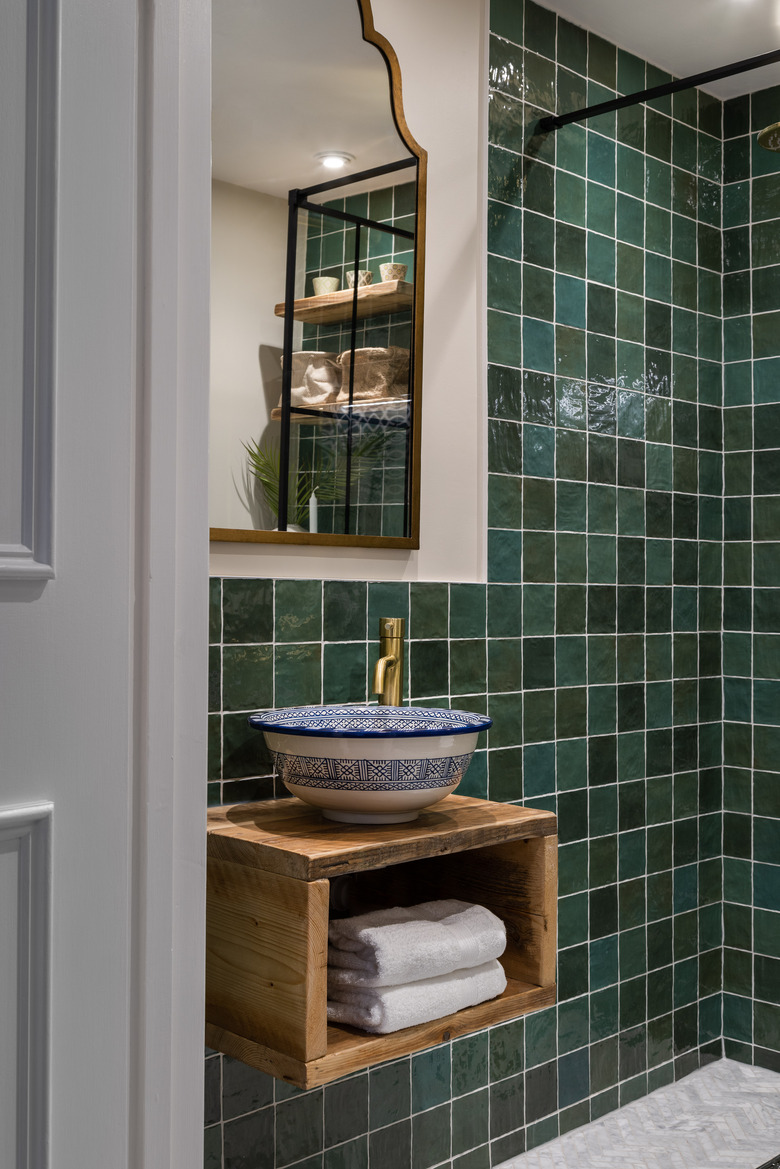While brass looks wonderful in a neutral setting, it also helps enhance an eclectic aesthetic. In fact, you could integrate brass fixtures into almost any bathroom design. Case in point: the single handle faucet in this Moroccan-inspired washroom from Topology. It works beautifully with the emerald green tiles, wood vanity, and ornate basin sink.