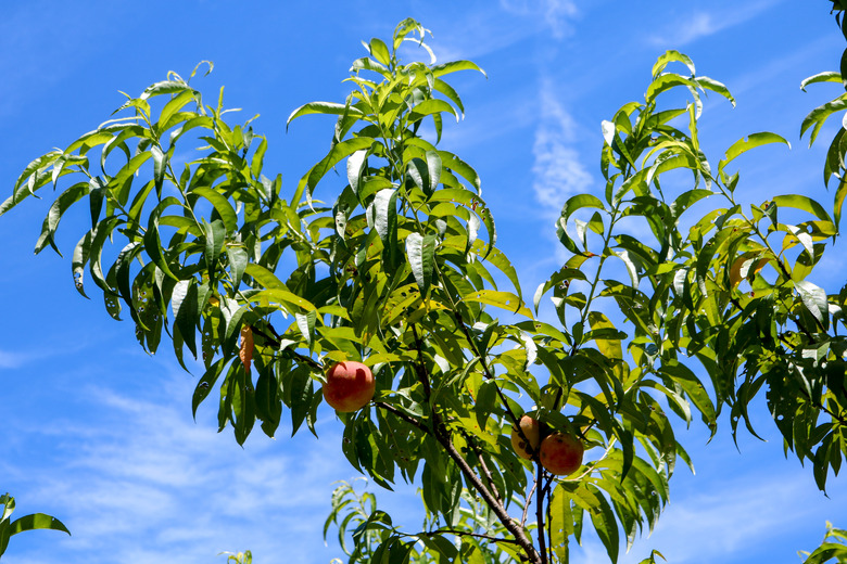 Peach trees are deciduous trees that produce pink or white blooms in the early spring. The fruit follows soon after and will ripen from June into August depending on the local climate and the cultivar planted. Standard-size peach trees can reach heights of up to 25 feet, although it is recommended to prune to a top height of about 10 to 15 feet to maximize fruit yield and to keep the fruit within reach when harvesting. The dwarf cultivar, Prunus persica 'Parade,' reaches 6 feet in height in USDA zones 5 through 9.