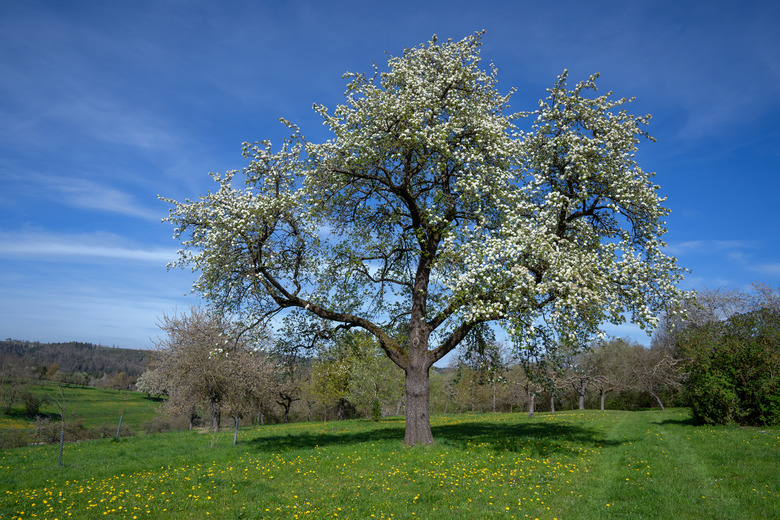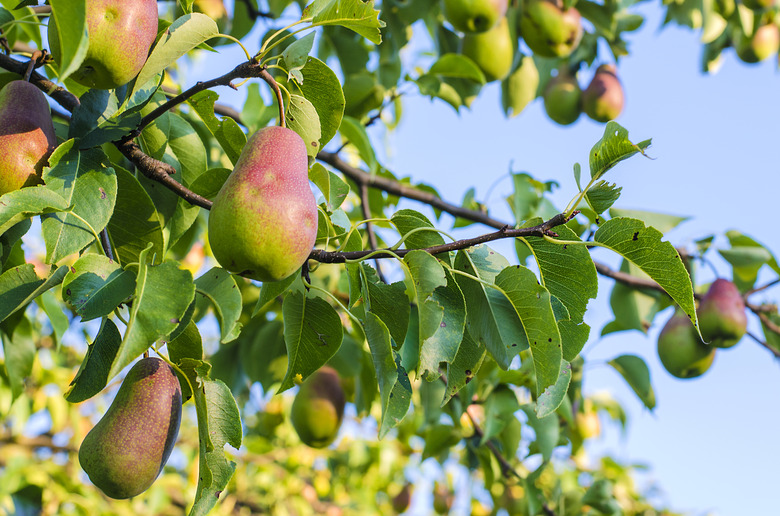 Nowadays, most pears are produced in Asia, though the trees are commonly grown in home gardens across North America. They're easy to grow and maintain, and they often grow very tall — up to 40 feet. The blossoms start as bright-green buds that transform into brilliant white flower clusters. Each cluster gives off a faint, sweet scent. Pear tree foliage has an oval shape with toothed edges. Leaves go from bright green to golden and then black as the seasons change.