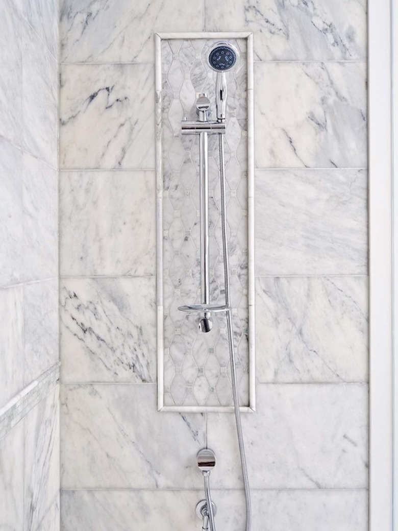 Carly Nemtean takes the guesswork out of making your showerhead a bona fide design feature thanks to a slide bar and tiled accent. To recreate the look, opt for a slightly varied marble tile pattern in the same stone as the shower walls for subtle definition.