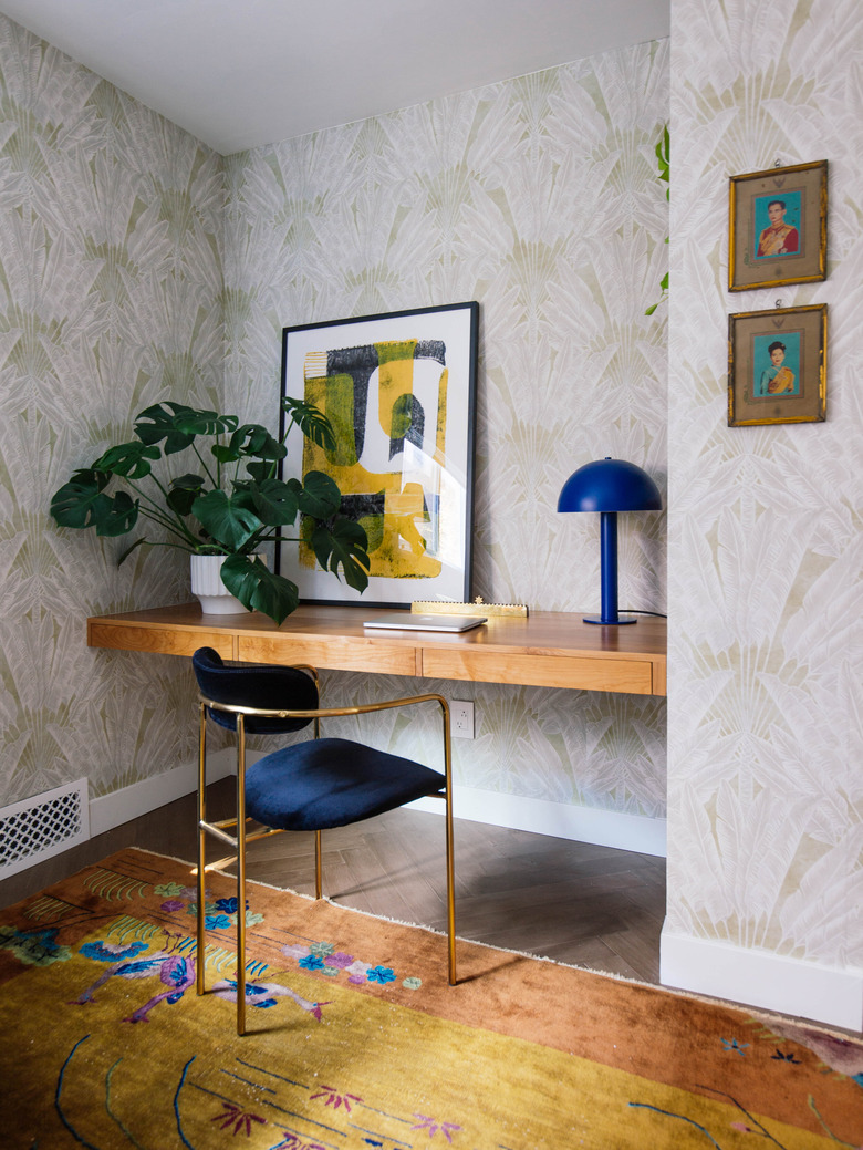 Midcentury modern design is playful at its core, and your home office should be no exception. In your workstation, mix patterned artwork with a busy area rug and detailed wallpaper, all featuring midcentury motifs — something that's easily spotted in this small space belonging to Dabito of Old Brand New.