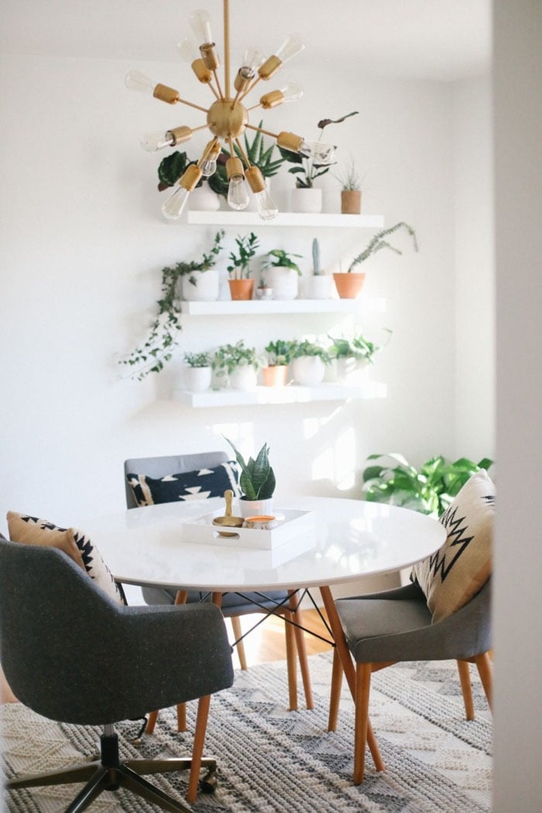 Maybe a traditional midcentury color palette, filled with shades of orange and goldenrod, just doesn't appeal to you. Well, good news: You can actually incorporate the hues you prefer while still embracing midcentury design ideas. This office by Ashley Rose of Sugar & Cloth looks oh-so-midcentury with its radiating chandelier and timeless office furniture, but weaves in a more contemporary color scheme with mint walls.