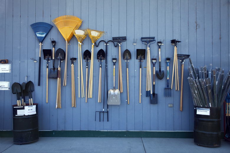 There are many different rakes out there, but you probably only need one or two of these garden tools. The most versatile rake is the bow rake, which is usually used for leveling soil and spreading out materials, such as mulch or gravel, but it can still be used for raking leaves and other debris. If you have a lot of leaves or light debris, a leaf rake is preferable since its loose tines run over grass, concrete and other materials more easily than those in a bow rake. A landscape rake, on the other hand, has particularly strong metal tines that can be used to level soil, gravel or mulch but are also strong enough to dethatch a lawn, though this is precisely why they aren't great for raking up leaves or other light debris.