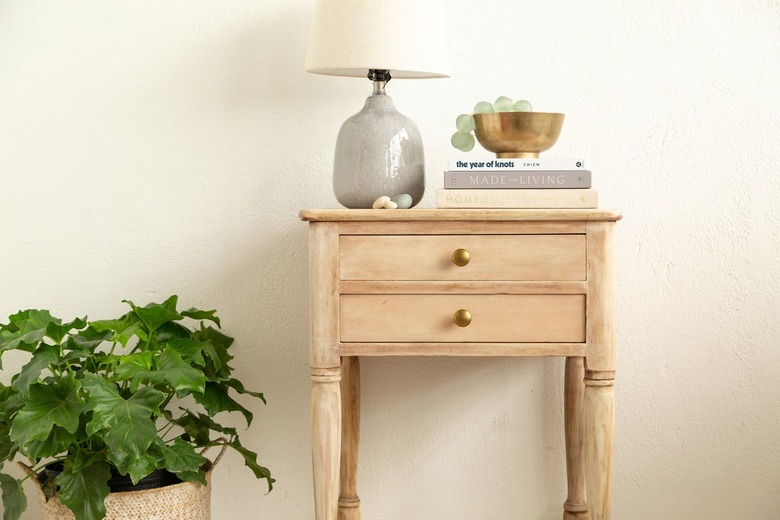 Be on the lookout at thrift or antique stores, Facebook Marketplace, and within your own home for a honey or darker wood stained piece of furniture. Wipe down the piece and remove any hardware.