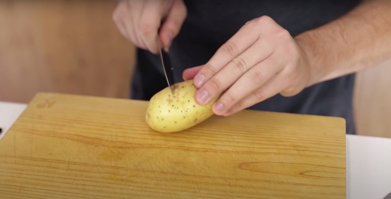 Lay the potato on its side. Using a sharp knife, cut a line all the way around the center of the potato. You'll want to twirl the potato as you go, so that the beginning and end of the line connect.