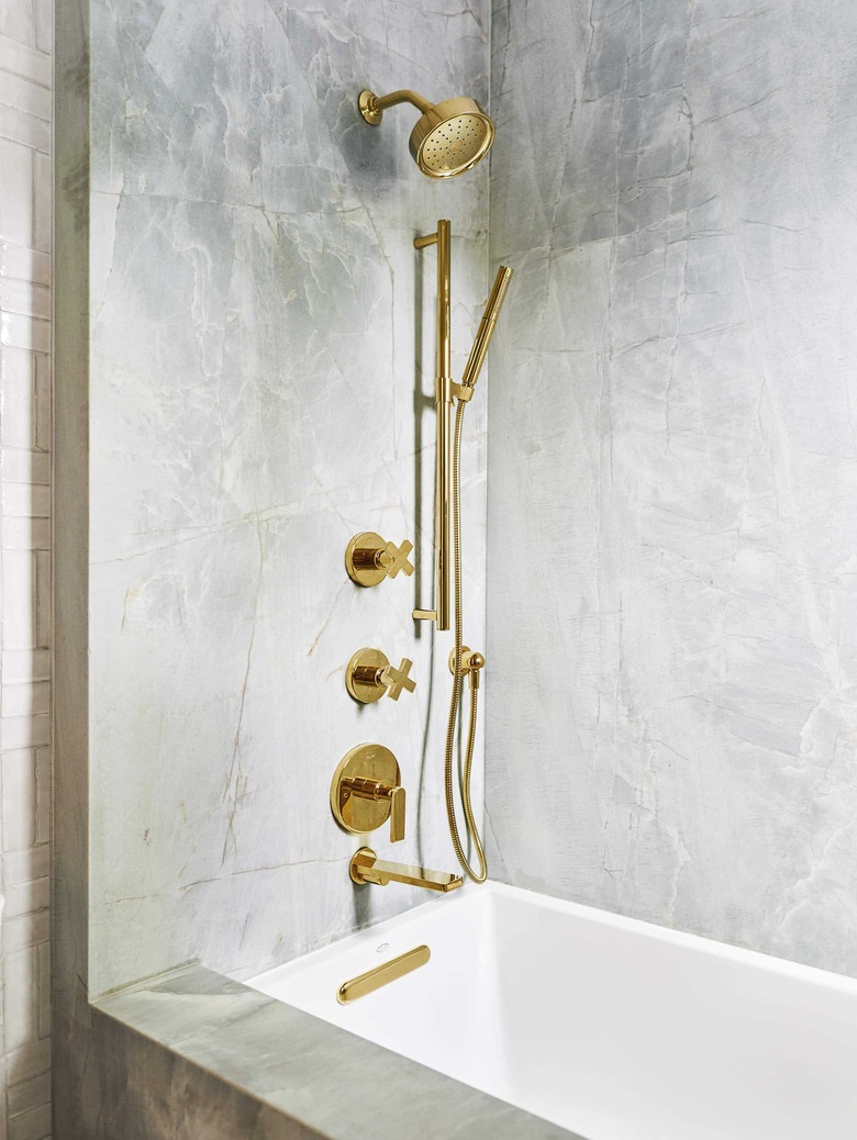Just because you have an industrial bath that doesn't mean you can't weave in a bit of glam. Take a page from Emily Henderson's book and pair the tough industrial feel of an emerald quartzite shower surround with gleaming brass faucets. Together, the lustrous trim kit and wall-mounted handshower are the epitome of luxury.