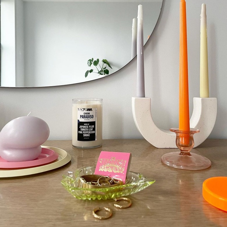 If you're not a fan of neutral shades, you can absolutely style bold and bright candles around your home. Alexandra Berrocal proves that bright-colored candles and abstract candleholders just go together. (More on the rise of uniquely shaped candleholders here). Berrocal's candle styling tricks also illustrate how easily you can add a pop of color to your space without going overboard or committing to a larger piece of furniture or decor.