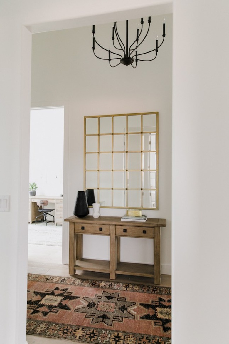 For slim halls and entryways, a large mirror will bounce around natural light beautifully. Place it above a console table, as interior designer Becki Owens did here, for maximum impact.