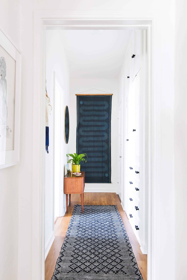 A statement runner should be a given in any narrow hallway with wooden floors, but have you thought about popping textiles on your wall space, too? Sara at Emily Henderson Design gave her slightly minimalist space a makeover by hanging a boho-style scarf as a wall tapestry. It draws your eye to the end of the passage and adds contrast to the bright white walls.