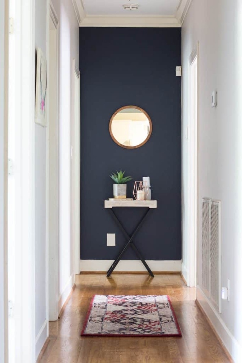 A lick of paint can make all the difference when you want a wow-worthy hallway, and you could finish the DIY job in a weekend. Feeling inspired? Take a look at the hall in Sherry of Savvy Apron's home. She painted the back wall in Hale-Navy by Benjamin Moore, adding in a wooden mirror and tray table for a little more depth.