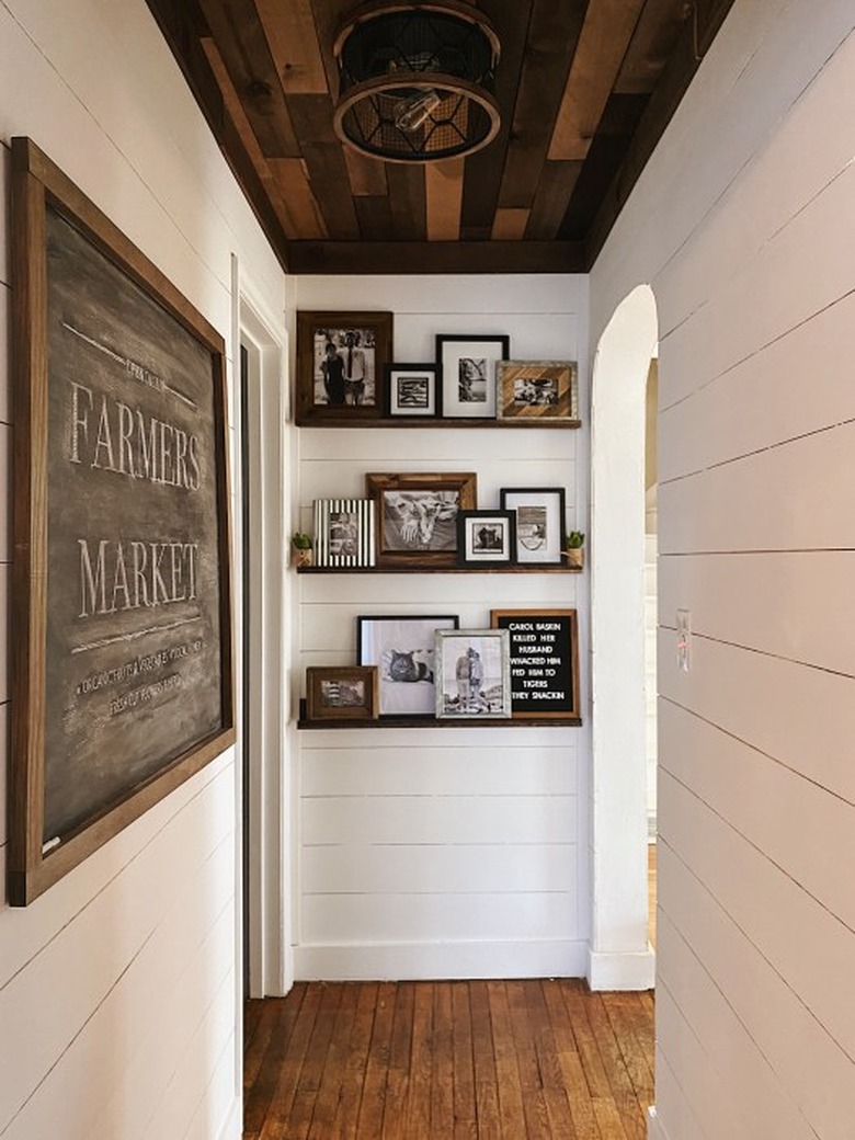 If you're feeling slightly over the gallery wall look, picture ledges are a great alternative with a similar effect. These shelves have a thin profile, making them ideal for tight walkways. Plus, they allow more flexibility when it comes to changing your decor. Interior blogger Janelle Trinette opted for high-quality wooden shelving in this hall makeover, adding contrast to the white shiplap walls.