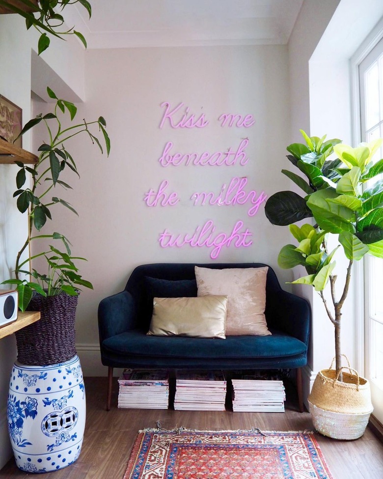 Want something a little bit extra for your hallway but not interested in a huge chandelier? A neon light could be the perfect answer, and it will work with nearly any style. Lisa Dawson shows us how to do it with this beautiful pink number set above a loveseat with lots of greenery.