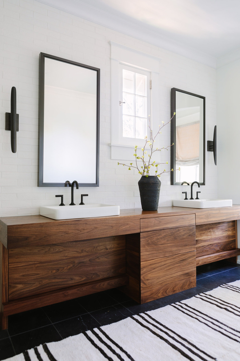 A statement vanity can change the whole vibe of your bathroom, and whether you're a minimalist or a maximalist, a floating option will add style and luxury to the room. We've seen them surge in popularity as homeowners try to replicate hotel luxury with double sinks. And this look also gives the illusion of more space. Go big or go home with a mounted sink, and don't be afraid to think above the box.