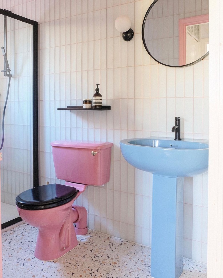 Remember those pastel '70s bathroom suites that everyone got rid of in the late '90s? Well, they're back in fashion, and it's time to think pink! Nab yourself an ice cream-hued set, and pair it with plain white subway tiles and colorful grout, à la Sarah Akwisombe. For those feeling less brave, why not opt for a striking tap in a bright and bold hue (we love any by Vola), or try a sink with a colorful concrete finish such as the Elm Mini from Kast Concrete Basins?