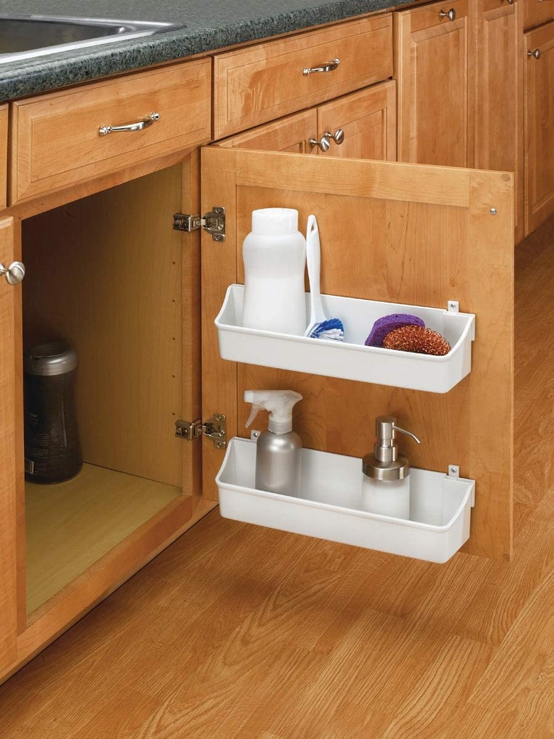 The door of your kitchen cabinet is teeming with storage potential, it just takes the right organizer. This brilliant pair of plastic door trays mounts to the inside of any cabinet door to create extra storage space out of thin air.