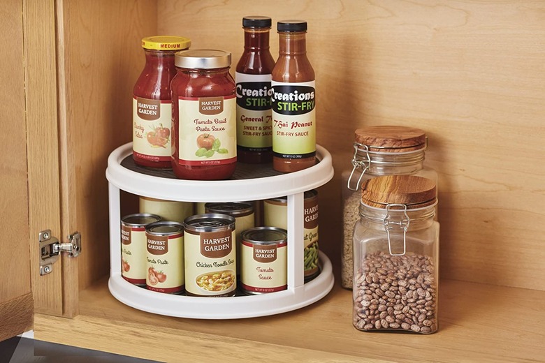 Turn the inside of a kitchen cabinet into a streamlined pantry with the help of a turntable-style organizer. This revolving turntable features two tiers of storage space — with a non-skid surface — for stacking spices, cans, condiments and more.