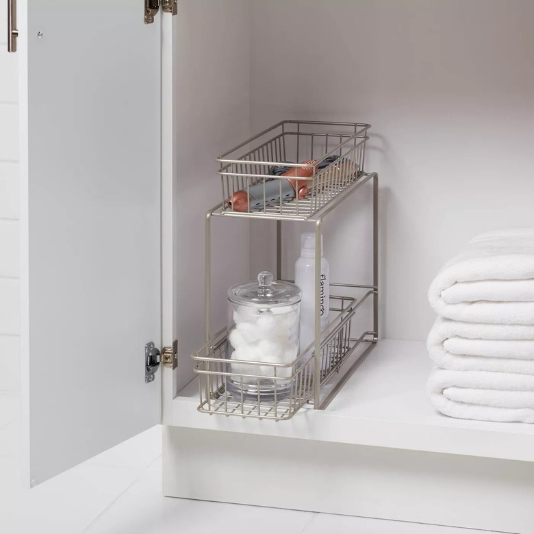 A slim storage rack with sliding drawers can be a game changer for the cabinet under your bathroom sink. This chic metal storage option offers two open shelves for corralling cosmetics and cleaning supplies, and measures just under seven inches wide.